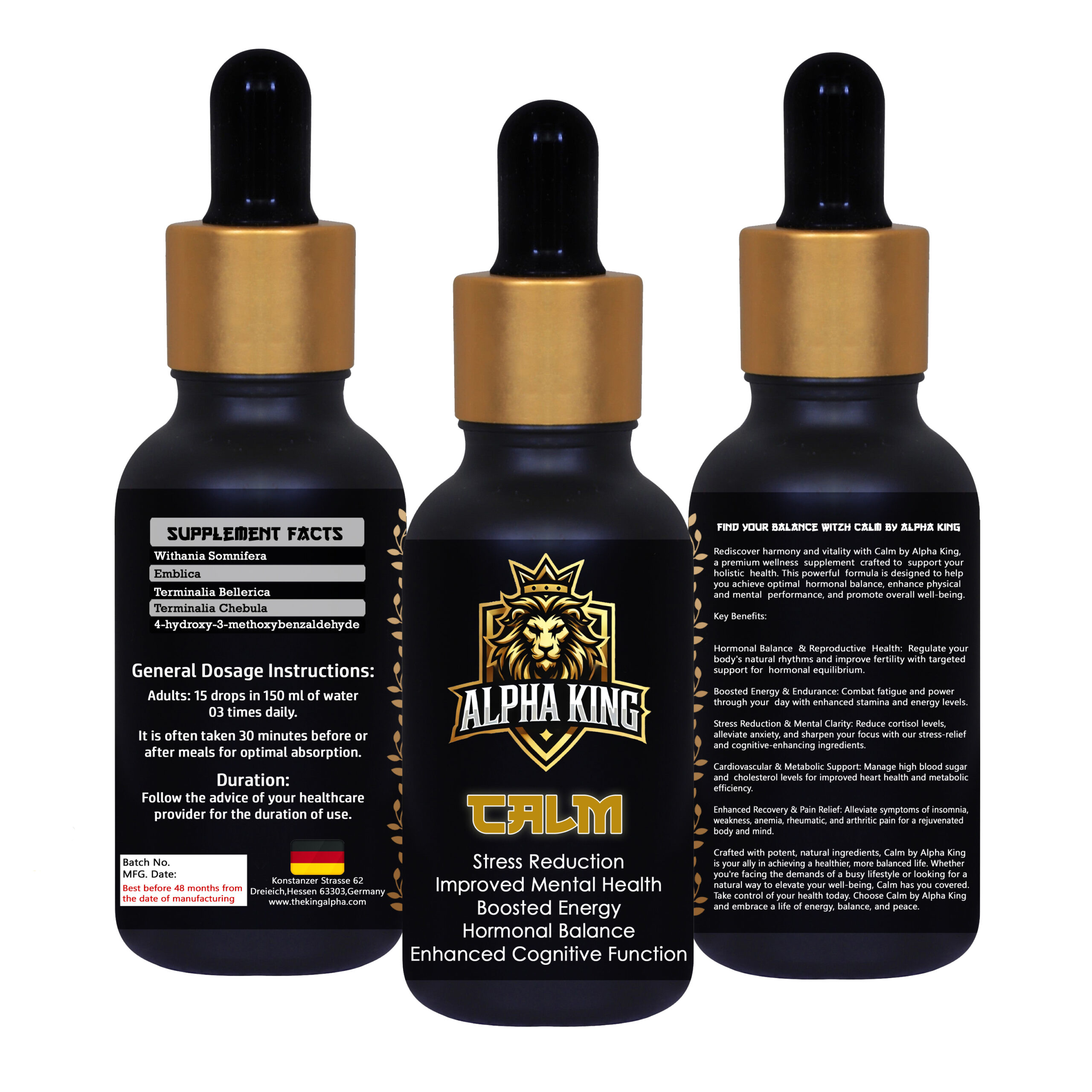” Alpha King CALM is a premium formulation designed to reduce stress, improve mental health, boost energy levels, promote hormonal balance, and enhance cognitive function. Crafted to support overall well-being, CALM helps restore mental clarity and vitality, enabling you to perform at your best every day.”
